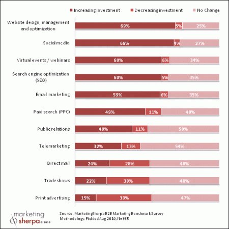 And so from the looks of it, according to the latest chart from MarketingSherpa, traditional marketing venues such as trade shows and advertising are still in play today and will be for the next year. Their latest study points out that “The majority of B2B organizations are increasing marketing budgets for inbound marketing tactics, including social media, virtual events and webinars, SEO and PPC”.