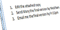 “Jen, I have reviewed the presentation for the webinar and here’s what you need to do: a) add the company logo to the master slide (upper left corner); b) replace slides 3 and 5 with the new ones I mention in my notes; c) review once more for grammar and style; d) send to John for formatting by Tues noon.”