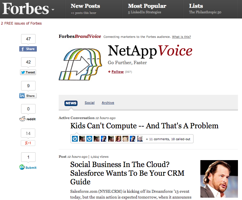 NetApp has a presence at Forbes.com BrandVoice site where it places content coming from contributors on a variety of topics including security challenges of BYOD to a personal column from NetApp Vice Chariman Tom Mendoza. Informative, well written content is strong and because it is features on Forbes.com is gains even more credibility and authority.